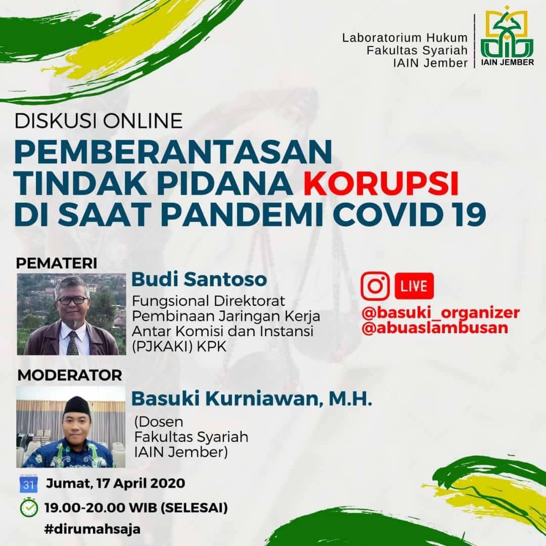 Jumat (17/4). Fakultas Syariah kini hadir kembali dengan seri diskusi online seputar pandemi Covid-19. Diskusi online via Instagram kali ini mengusung tema "Pemberantasan Tindak Pidana Korupsi di Saat Pandemi COVID19". Diskusi yang diselenggarakan Laboratorium Fakultas Syariaah IAIN Jember ini selalu menghadirkan narasumber kompeten dan memungkinkan para peserta menanyakan hal-hal yang berkaitan dengan COVID19 termasuk Pemberantasan Korupsi.