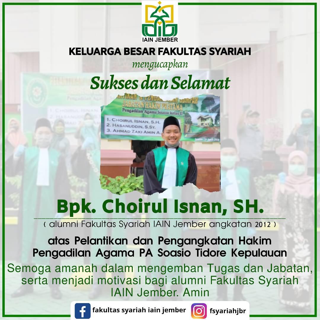 Ya, nama lengkapnya Choirul Isnan, SH lahir di kota gandrung yang sering dijuluki The Sunrise Of Java. Yupps benar, Anak dari pasangan suami istri, Bapak Samsuri dan Ibu Muawanah lahir di Banyuwangi 20 November 1993. Tepatnya di daerah Karangrejo. Semasa kecil, Ia sering disapa Iyunk. Nama imut inilah yang menjadi ciri khas anak kedua dari dua bersaudara ini. Namun di kampus lebih akrab disapa Isnan. Dia adalah mahasiswa Fakultas Syariah (dulu namanya Jurusan Hukum Islam) Program Studi Al-Ahwal Asy-Syakhsiyyah (AS). Masuk ke IAIN Jember (dulu STAIN Jember) pada tahun 2012 dan lulus tahun 2017. Berstatus belum menikah, tapi berita baiknya alhamdulilah sudah memiliki calon pasangan hidup yang kebetulan jebolan dari Prodi Hukum Ekonomi Syariah (HES) Fakultas Syariah IAIN Jember. Sempat meminta doa agar segera dipercepat melepas masa lajangnya dan monggo kita amini bersama ya sahabat. Aamiin