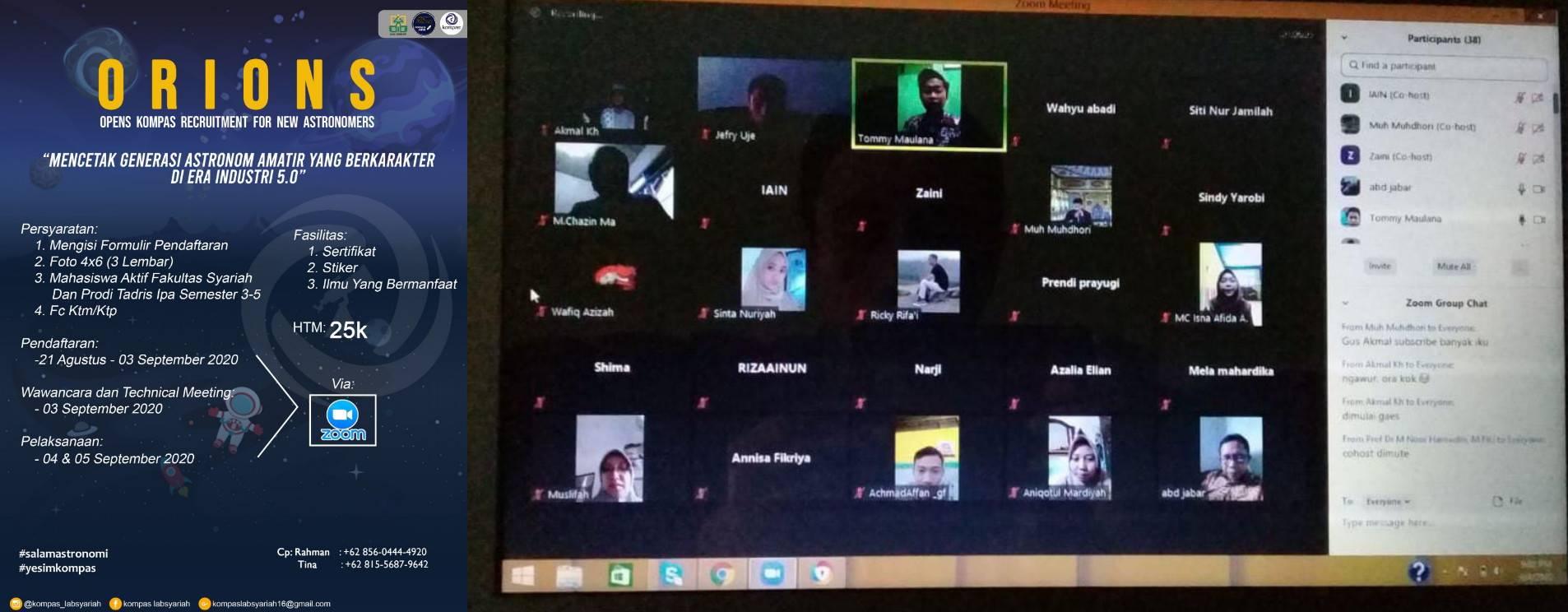 Media Center-KOMPAS (Komunitas Pecinta Astronomi) Laboratorium Fakultas Syariah IAIN Jember menggelar opening ORIONS (Open Kompas Recruitment for New Astronomers) yang dilaksanakan secara daring melalui aplikasi Zoom Meeting. Acara dengan tema ‘Mencetak Generasi Astronom Amatir yang Berkarakter di Era Industri 5.0’ ini akan dilaksanakan selama 2 hari berturut-turut, mulai tanggal 4-5 September 2020.
