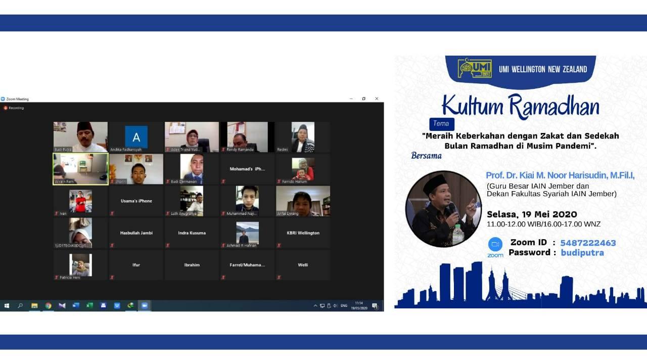 Setelah mengisi kultum Ramadlan di Sydney Australia, Dekan Fakultas Syariah IAIN Jember, Prof. Kiai M Noor Harisudin, M. Fil.I juga diminta untuk mengisi acara serupa di Wellington Selandia Baru atau New Zealand, Selasa, 19 Mei 2020. Acara Kultum Ramadlan kali ini diselenggarakan secara daring oleh UMI Wellington melalui aplikasi zoom. Wellington sendiri adalah ibu kota New Zealand, the coolest little capital in the world, Ibu Kota kecil yang paling keren se dunia. Dalam acara itu, hadir ratusan jama’ah yang terdiri dari Dubes di KBRI Wellington, KBRI Canberra, jamaah UMI, umat Islam New Zealand, muslim Australia, dan muslim Indonesia juga hadir di acara bergengsi tersebut. Kultum ini diselenggarakan mulai jam 11.00-12.15 WIB atau 16.00 hingga jam 17.15 WNZ tersebut.