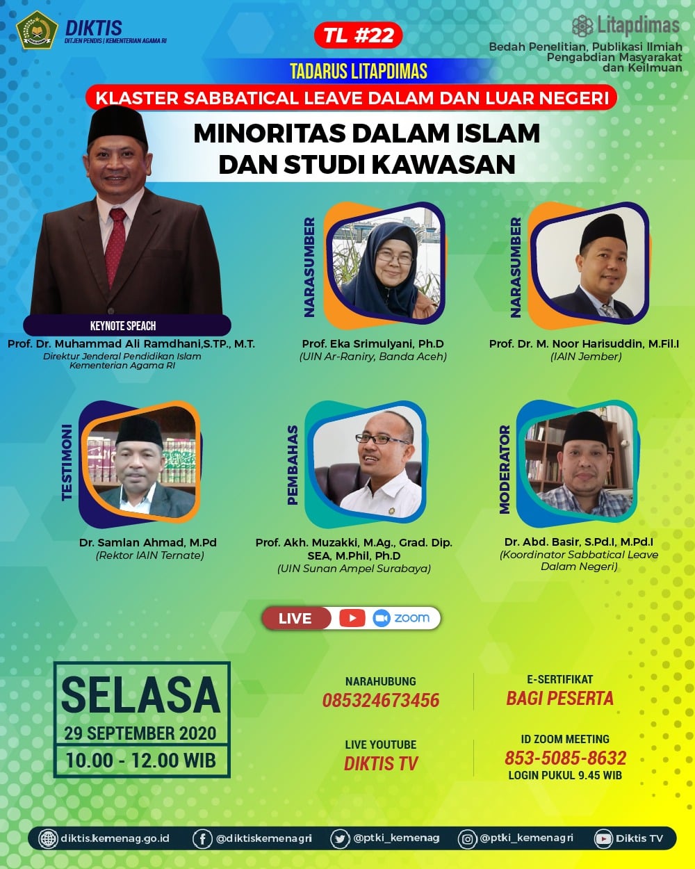 Media Center. Direktorat Pendidikan Tinggi Keagamaan Islam (DIKTIS) Kementerian Agama RI (DIKTIS) mengadakan acara Tadarus Litapdimas, Klaster Sabbatical leave Dalam dan Luar Negeri, dengan tema “Minoritas dalam Islam dan Studi Kawasan.” Selasa (29/09/2020).