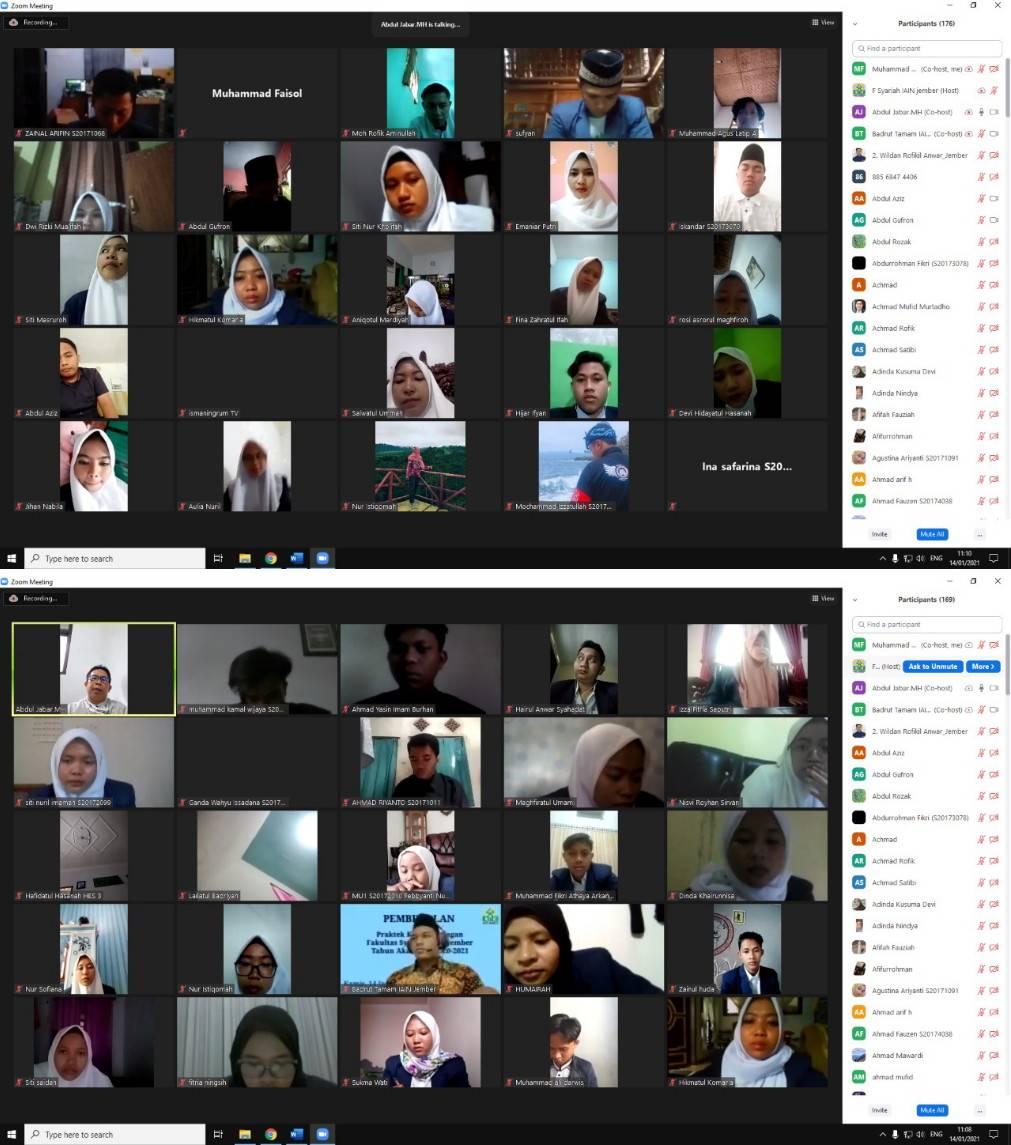 Media Center – Di tengah pandemi Covid-19, Laboratorium Fakultas Syariah IAIN Jember tetap menggelar pembekalan kepada para mahasiswa untuk menghadapi kegiatan Praktik Kerja Lapangan (PKL) dan Praktik Pengalaman Lapangan (PPL) tahun ajaran 2020/2021 yang dilaksanakan secara virtual zoom meeting, pada Kamis pagi (14/1).
