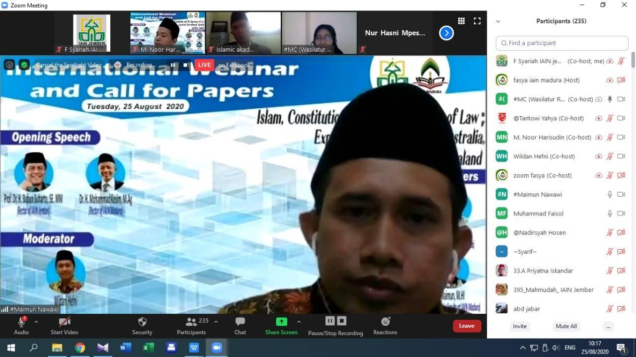 Media Center – Pada hari Selasa (25/8/2020) Fakultas Syariah IAIN Jember yang bekerjasama dengan Fakultas Syariah IAIN Madura mengadakan sebuah acara International Webinar and Call for Papera, dengan tema “ Islam, Constitution, and The Supremacy of Law Experience From Indonesia, Australia, and New Zealand” dimana dalam acara webinar internasional itu tidak hanya menyuguhkan sebuah penyampaian tentang tema itu, tapi dalam acara tersebut juga ada sebuah presentasi paper yang ditulis oleh dosen-dosen terkemuka di Indonesia.