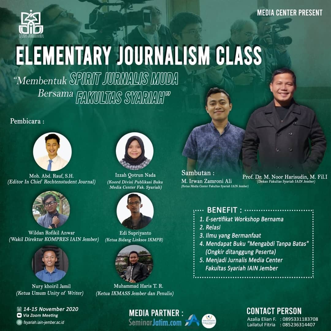Jember- Media Center Fakultas Syariah IAIN Jember mengadakan Workshop “Elementary Journalism Class (EJC),” dengan tema bertajuk “Membentuk Spirit Jurnalis Muda Bersama Fakultas Syariah.” Tujuan diadakannya acara ini adalah untuk mencetak kader-kader baru Media Center Fakultas Syariah Institut Agama Islam Negeri (IAIN) Jember, serta dalam rangka menumbuhkan semangat mahasiswa dalam bidang jurnalistik. Acara ini berlangsung selama dua hari dimulai pada Hari Sabtu hingga Minggu 14-15 November 2020 menggunakan aplikasi Zoom Meating. Adapun Support System dari acara ini yaitu seminar Jatim, Teman acara, Disceptatio yang membantu suksesnya acara Workshop kali ini. (Minggu, 15/11/2020).