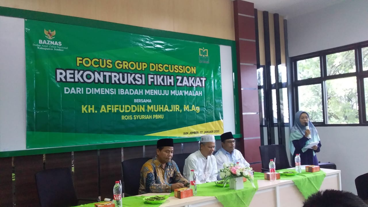 Fakultas Syari’ah IAIN Jember bekerjasama dengan Badan Amil Zakat Nasional (BAZNAS) Kabupaten Jember kembali melaksanakan event akademis yang dikemas dalam Focus Group Discussion dengan tema “Rekonstruksi Fikih Zakat dari Dimensi Ibadah menuju Mu’amalah” yang menghadirkan narasumber K.H. Afifuddin Muhajir, M.Ag, Ro’is Syuri’ah PBNU dan Wakil Pengasuh Pondok Pesantren Salafiyah Syafi’iyah Sukorejo Situbondo. Kali ini sosok yang akrab disapa Kyai Afif itu menjadi narasumber pada acara FGD yang diselenggarakan oleh Fakultas Syari’ah IAIN Jember bersama BAZNAS Kabupaten Jember, Rabu (08/01/2019) dengan tema “ Rekonstruksi Fikih Zakat dari Dimensi Ibadah menuju Mu’amalah”.