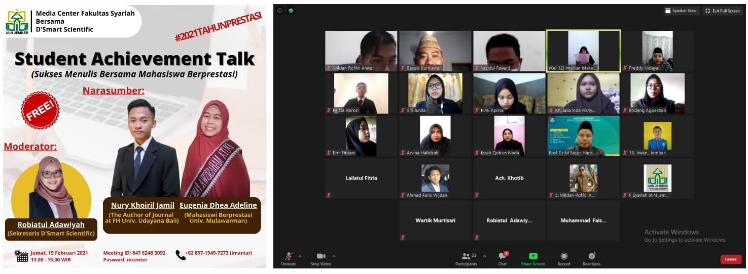 Kali ini Media Center bekerjasama dengan D’Smart Scientific berhasil menggelar Student Achievement Talk untuk yang kedua kalinya dengan tema yang bertajuk “Sukses Menulis Bersama Mahasiswa Berprerstasi”. Student Achievement Talk kali ini turut menghadirkan Nury Khoiril Jamil yang merupakan The Author of Journal at Law Faculty in Udayana University dan Eugenia Dhea Adeline yang juga merupakan mahasiswa berprestasi di Universitas Mulawarman, yang di Moderatori oleh Robiatul Adawiyah Selaku Sekretaris dari D’Smart Scientific. Kegiatan ini berlangsung pada Jumat (19/2/2021) melalui via zoom meeting.