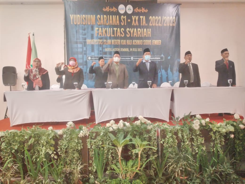 Media Center - Fakultas Syariah Universitas Islam Negeri Kiai Haji Achmad Siddiq (UIN KHAS) Jember kembali menggelar Yudisium Sarjana Strata 1 ke-20 di Hotel Aston Jember, pada Selasa (19/7). Prosesi Yudisium ini melepaskan 82 orang mahasiswa yang terdiri dari Program studi (Prodi) Hukum Ekonomi Syariah (HES), Prodi Hukum Keluarga (HK), Prodi Hukum Pidana Islam (HPI), dan Prodi Hukum Tata Negara (HTN).