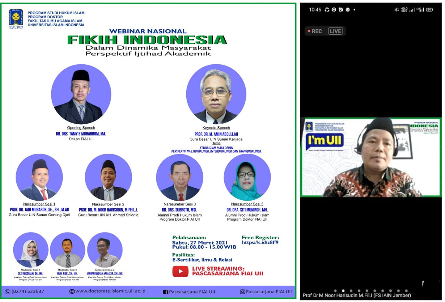 Media Center – Fikih Islam sejak pertama kali telah berinteraksi dengan realitas sekitar masyarakat, dimana fikih dirumuskan dan diterapkan. Hal ini menjadi pengaruh yang cukup dominan dalam melempangkan munculnya gagasan Fikih Indonesia. Program Studi Hukum Islam Program Doktor Fakultas Ilmu Agama Islam Universitas Islam Indonesia (UII) berhasil menyelenggarakan Webinar Nasional dengan tema “Fikih Indonesia Dalam Dinamika Masyarakat Perspektif Ijtihad Akademik”. Acara berlangsung melalui aplikasi Zoom Meeting dan Live Streaming Youtube Pasca Sarjana UII yang dihadiri sebanyak 250 peserta diseluruh Indonesia.