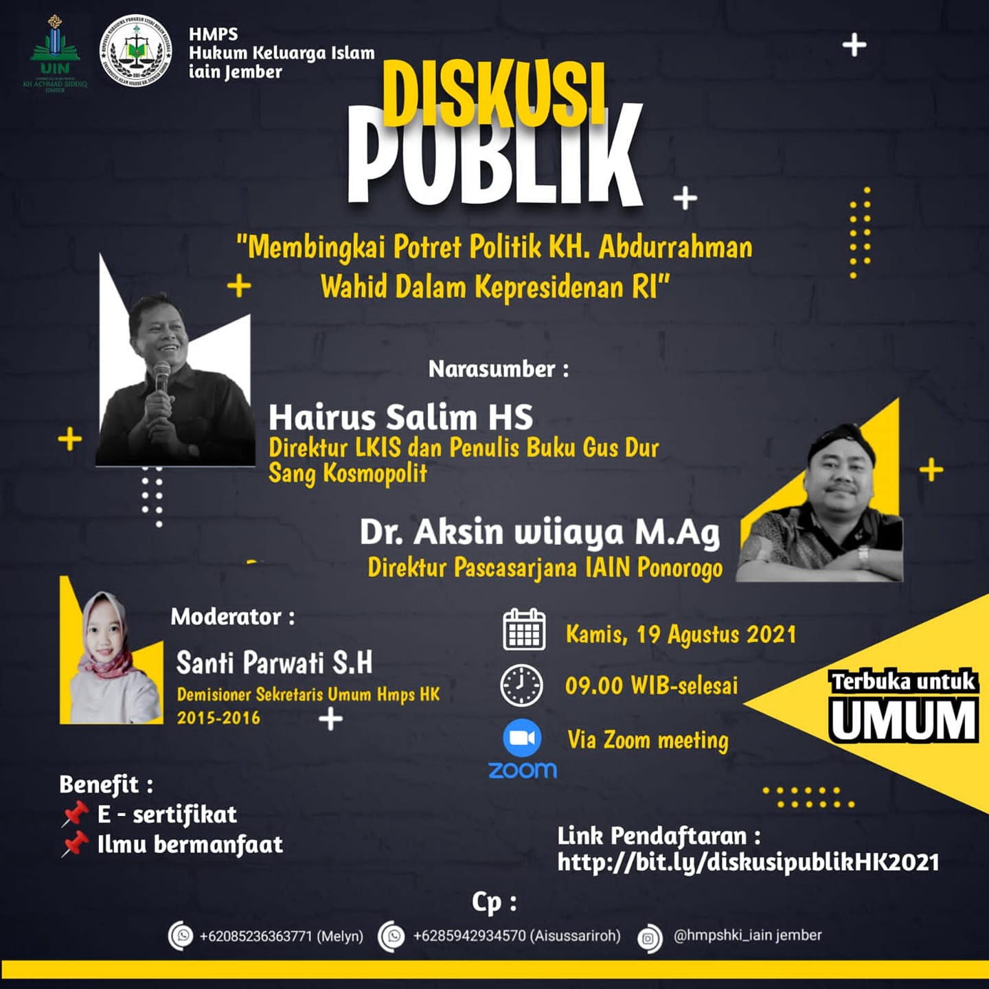 Media Center- Abdurrahman Wahid yang akrab disapa Gus Dur merupakan tokoh Muslim Indonesia yang menjadi Presiden dari tahun 1999 hingga 2001. Dalam rangka memperingati Hari Ulang Tahun Kemerdekaan Republik Indonesia ke-76, Himpunan Mahasiswa Program Studi (HMPS) Hukum Keluarga Universitas Islam Negeri (UIN) Kiai Haji Achmad Siddiq (KHAS) Jember menyelenggarakan Diskusi Publik “Membingkai Potret Politik KH. Abdurrahman Wahid Dalam Kepresidenan RI”. Acara ini dilaksanakan secara virtual pukul 09.00 WIB melalui Zoom meeting pada Kamis (19/8).