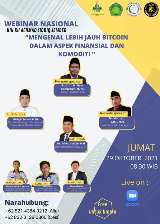 Media Center - Guna memperdalam keilmuan serta membangun semangat generasi muda dalam bidang hukum, Himpunan Mahasiswa Program Studi (HMPS) Hukum Ekonomi Syariah adakan Webinar Nasional dengan tema “Mengenal Lebih Jauh Bitcoin dalam Aspek Finansial dan Komoditi”. Webinar Nasional yang merupakan bentuk sinergi antara HMPS HES UIN KHAS Jember dengan HMPS HES UIN Maulana Malik Ibrahim Malang ini dilaksanakan pada Jumat (29/10). Webinar ini dimoderatori oleh Muhammad Reza Saputra, Sekretaris Umum HMPS HES UIN KHAS Jember.