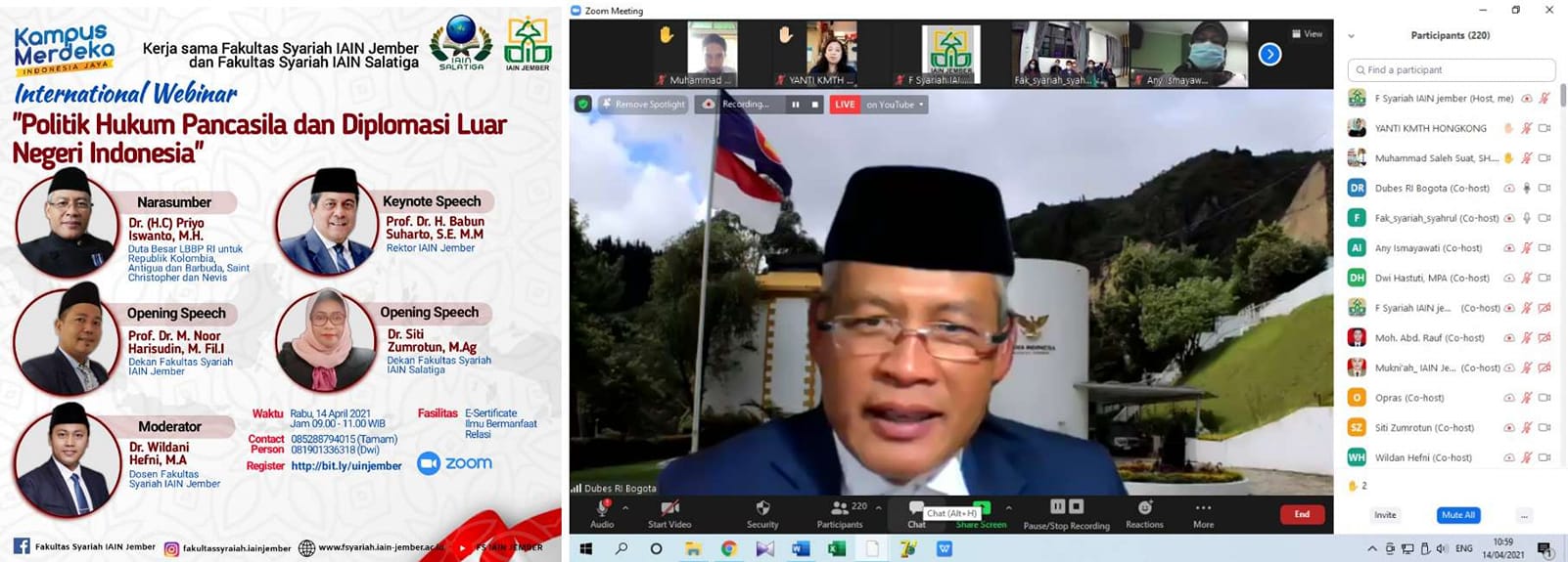 Media Center- Adakan agenda bersama, Fakultas Syariah IAIN Jember gandeng Fakultas Syariah IAIN Salatiga dan Fakultas Syariah IAIN Kudus dalam acara International Webinar pada Rabu 14/04 dengan tema “Politik Hukum Pancasila dan Diplomasi Luar Negeri Indonesia”