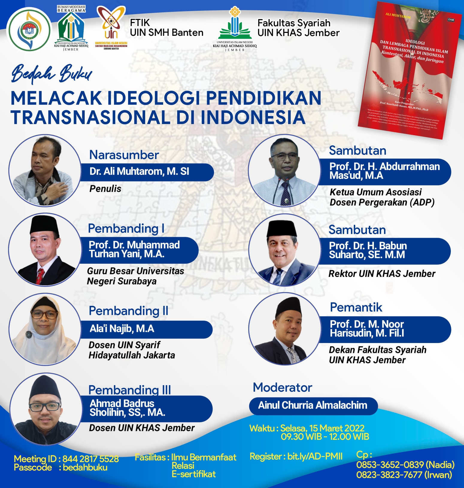 Mengingat banyaknya kelompok-kelompok keislaman di Indonesia, Departemen Publikasi & Desiminasi Asosiasi Dosen Pergerakan bersama Fakultas Syariah Universitas Islam Negeri Kiai Haji Ahmad Siddiq (UIN KHAS) Jember, Rumah Moderasi Beragama LPPM UIN KHAS Jember dan FTIK UIN Banten menyelenggarakan acara Bedah Buku bertema, “Melacak Ideologi Pendidikan Transnasional di Indonesia” pada Selasa (15/3) secara daring melalui Zoom Meeting.