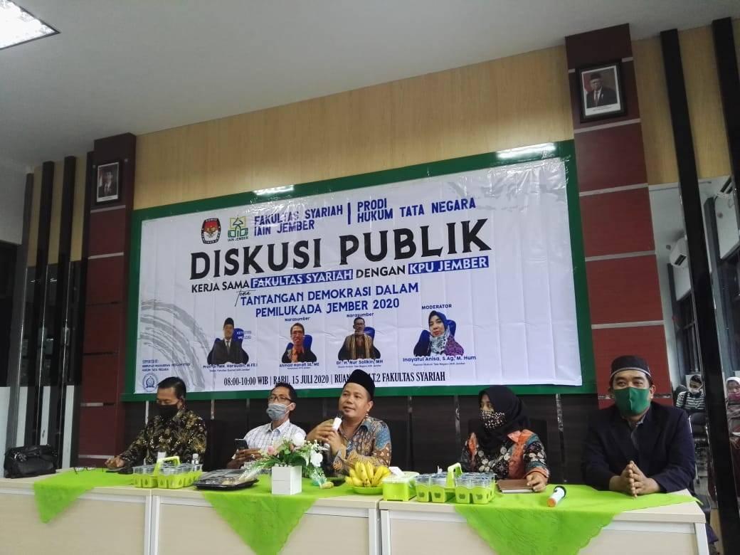 Kegiatan yang dilaksanakan oleh Prodi Hukum Tata Negara yang merupakan hasil kerja sama Fakultas Syariah IAIN Jember dengan Komisi Pemilihan Umum (KPU) Kabupaten Jember dan didukung oleh Himpunan Mahasiswa Program Studi Hukum Tata Negara (HMPS HTN) tersebut berhasil dilaksanakan pada Hari Rabu, 15 Juli 2020 jam 08.00 sd 10.00 WIB. Kegiatan berupa diskusi publik yang bertemakan “Tantangan Demokrasi dalam Pemilukada Jember 2020” tersebut dilaksanakan di Aula VIP Lantai 2 Fakultas Syariah IAIN Jember.