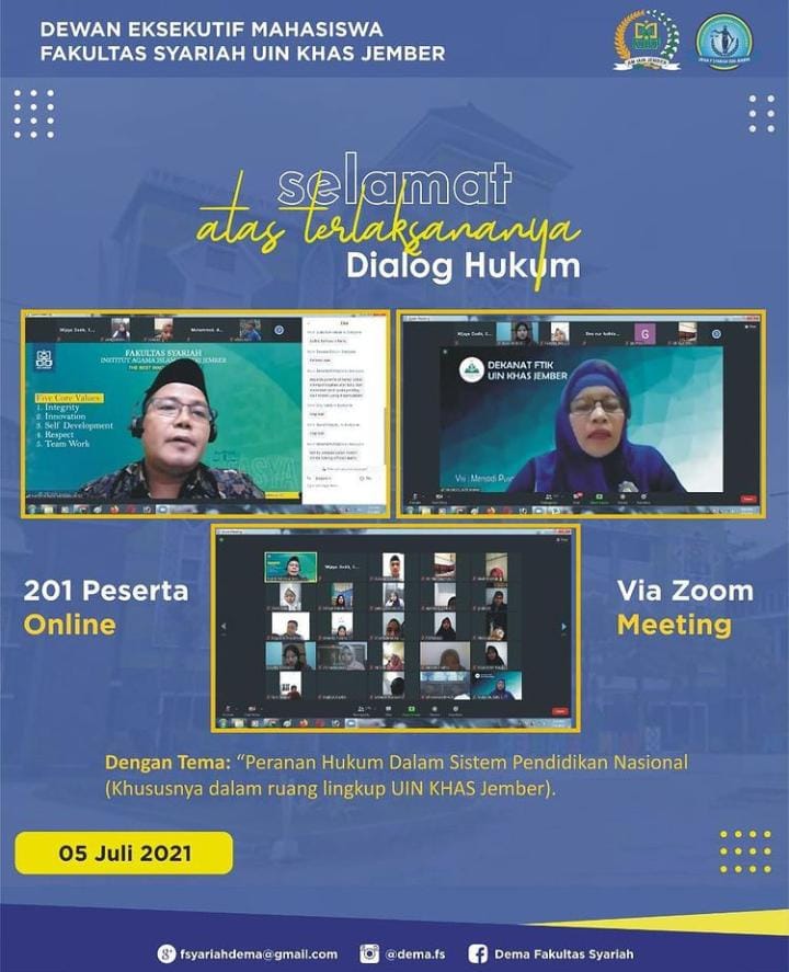 Media Center - Dewan Eksekutif Mahasiswa (DEMA) Fakultas Syariah Universitas Islam Negeri (UIN) Kiai Haji Achmad Siddiq (KHAS) Jember menyelenggarakan acara Dialog Hukum dengan tema “Peranan Hukum dalam Sistem Pendidikan Nasional” (Khususnya dalam Ruang Lingkup UIN KHAS) pada Senin malam, (5/7) pukul 19.00-selesai.