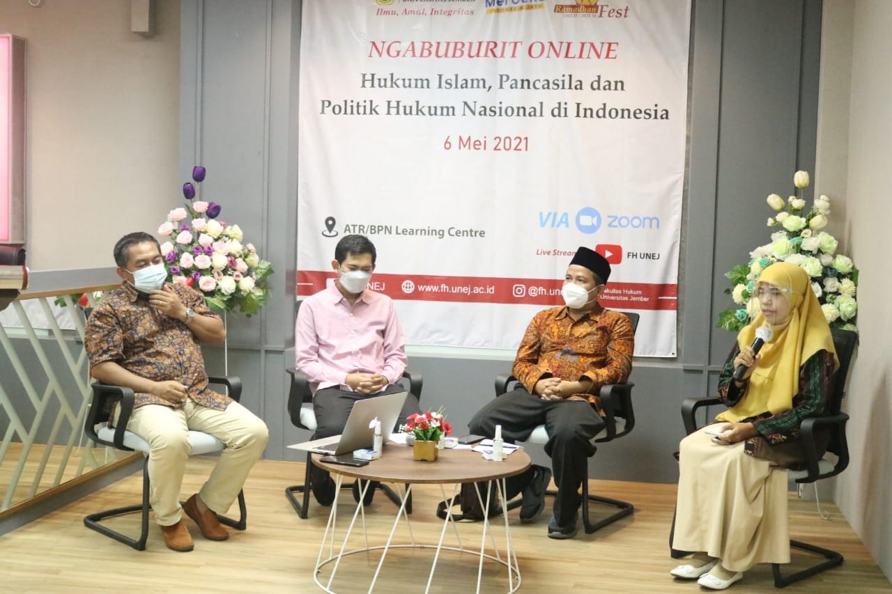 Media Center- Di penghujung bulan Ramadhan yang penuh berkah (Syahrul Mubarak), Ramadhan Fest 1442 H/2021 M Fakultas Hukum Universitas Jember melangsungkan acara ngabuburit online yang bertema “Hukum Islam, Pancasila, dan Politik Hukum Nasional di Indonesia”. Acara ini diikuti oleh ratusan peserta melalui aplikasi online Zoom Meeting, dan live streaming Youtube serta offline pada Kamis pukul 15.30 WIB (6/5/2021).