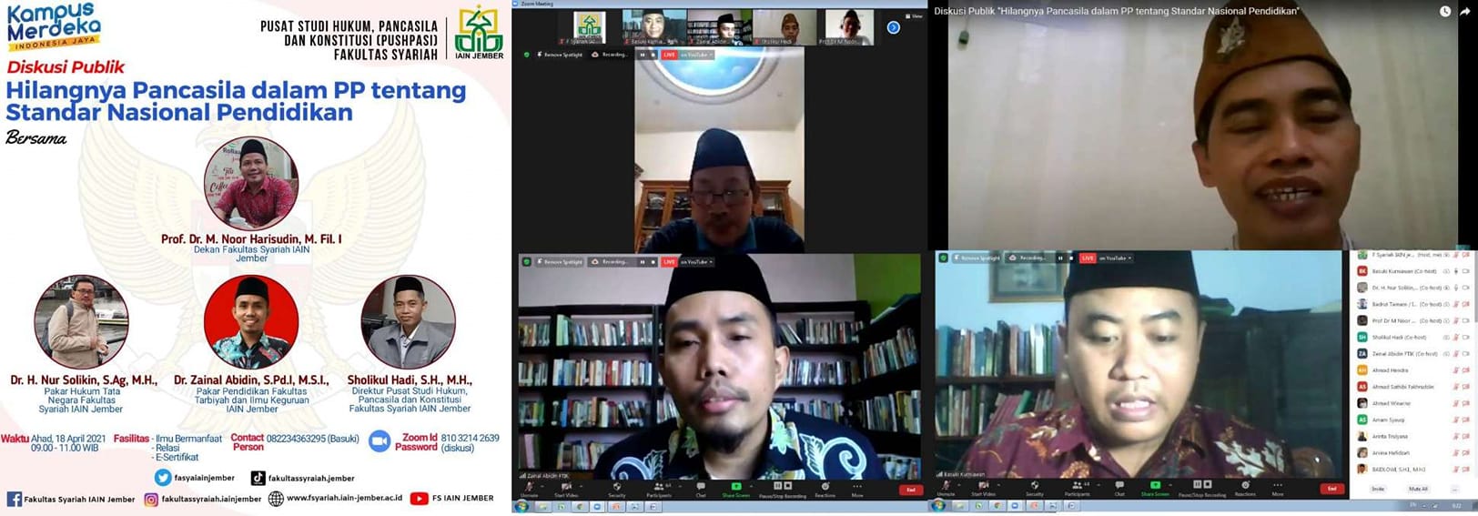 Minggu 18 April 2021 Pusat Studi Hukum Pancasila dan Konstitusi (PUSHPASI) Fakultas Syariah IAIN Jember melaksanakan Diskusi Publik dengan tema Hilangnya Pancasila dalam PP tentang Standar Nasional Pendidikan. Meski dalam waktu akhir pekan PUSHPASI terus bekerja untuk memberikan masukan dalam regulasi d Indonesia. Kegiatan ini dilaksanakan melalui media daring zoom dengan menghadirkan pakar pada bidangnya masing-masing.