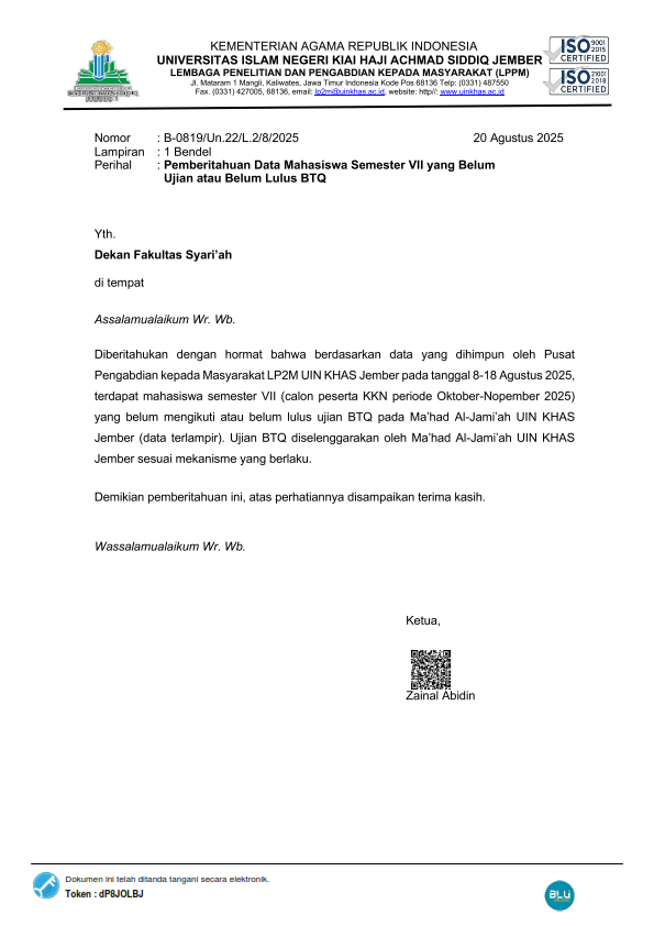 Pemberitahuan Data Mahasiswa Semester VII yang Belum Ujian atau Belum Lulus BTQ