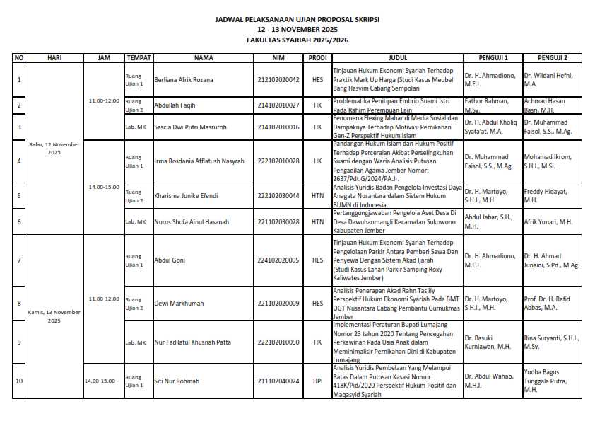PENGUMUMAN JADWAL UJIAN PROPOSAL SKRIPSI 12 - 13 NOVEMBER 2025