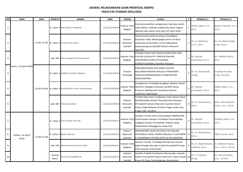 PENGUMUMAN JADWAL UJIAN PROPOSAL SKRIPSI 13-22 APRIL 2026