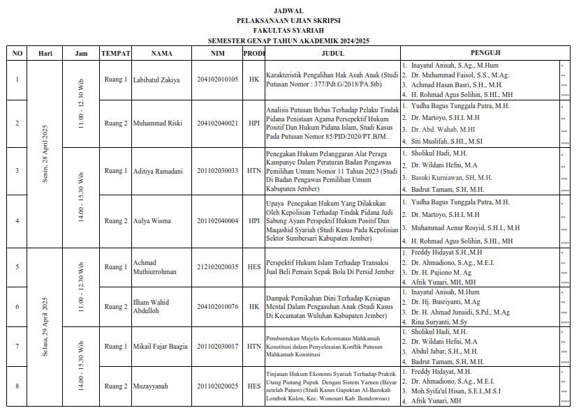 PENGUMUMAN JADWAL UJIAN SKRIPSI 28 APRIL - 21 MEI 2025 REVISI JADWAL : JADWAL UJIAN HARI SENIN 5 MEI 2025 JAM 14.00 DIMUNDURKAN HARI SELASA 6 MEI 2025 JAM 11.00 DI RUANG LABORATORIUM MK DAN PS DOWNLOAD JADWAL DOWNLOAD SURAT PENGUJI