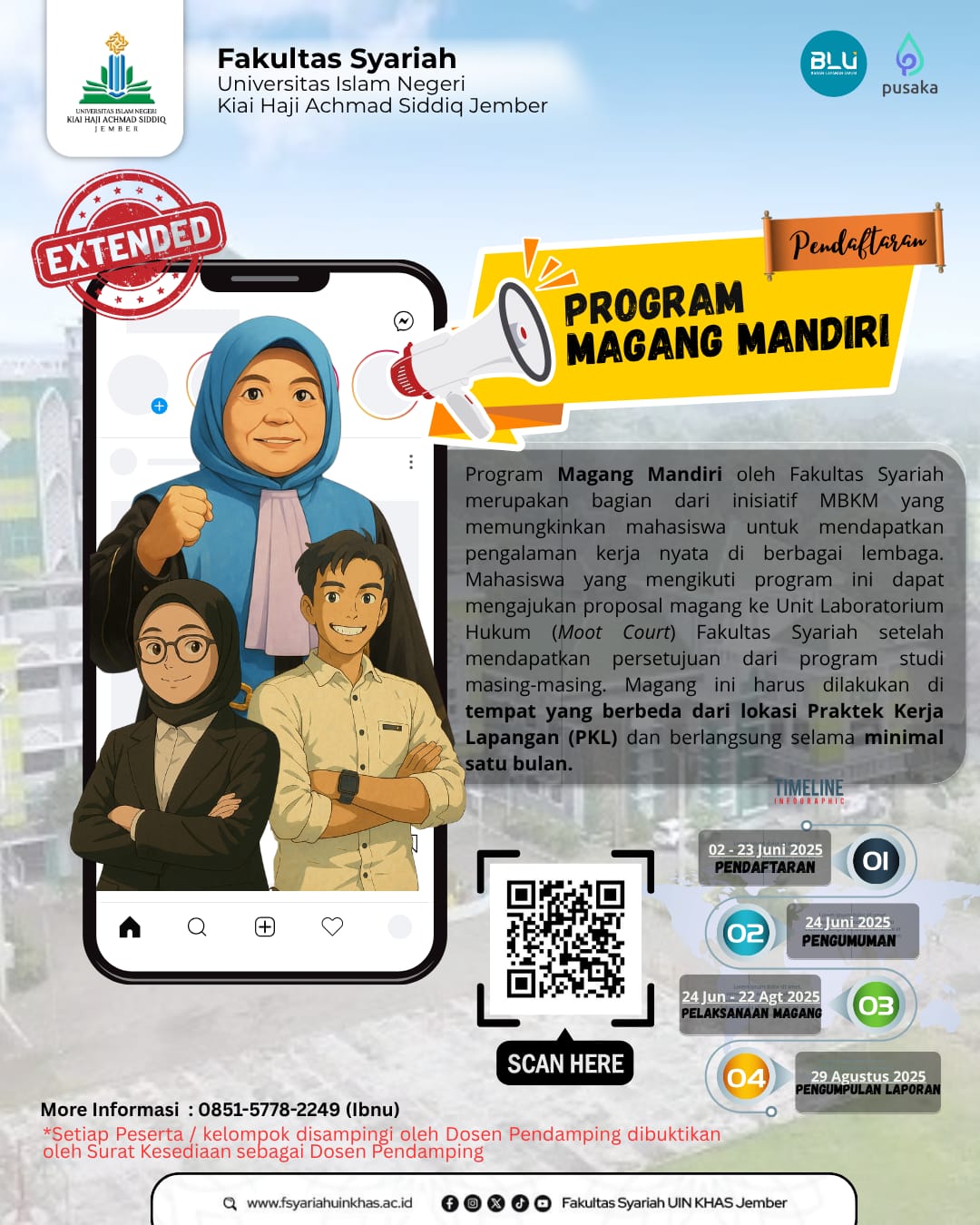 Diberitahukan kepada seluruh mahasiswa Fakultas Syariah UIN Kiai Haji Achmad Siddiq Jember bahwa *pendaftaran program Magang Mandiri diperpanjang hingga tanggal 23 Juni 2025*.