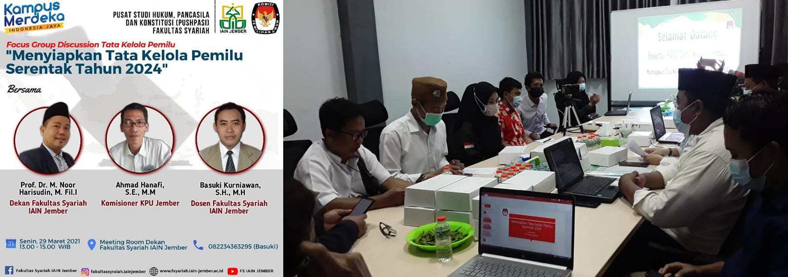 Sebagai akademisi sudah menjadi suatu kewajiban untuk mengenali, memahami serta berpartisipasi dalam persiapan terhadap Pemilu tahun 2024 mendatang. Pusat Studi Hukum, Pancasila dan Konstitusi (PUSHPASI) Fakultas Syariah mengadakan FGD (Focus Group Discussion) Tata Kelola Pemilu dengan tema “Menyiapkan Tata Kelola Pemilu Serentak Tahun 2024” . Acara diselenggarakan di Meeting Room Dekan Fakultas Syariah IAIN Jember, Senin, (29/3).