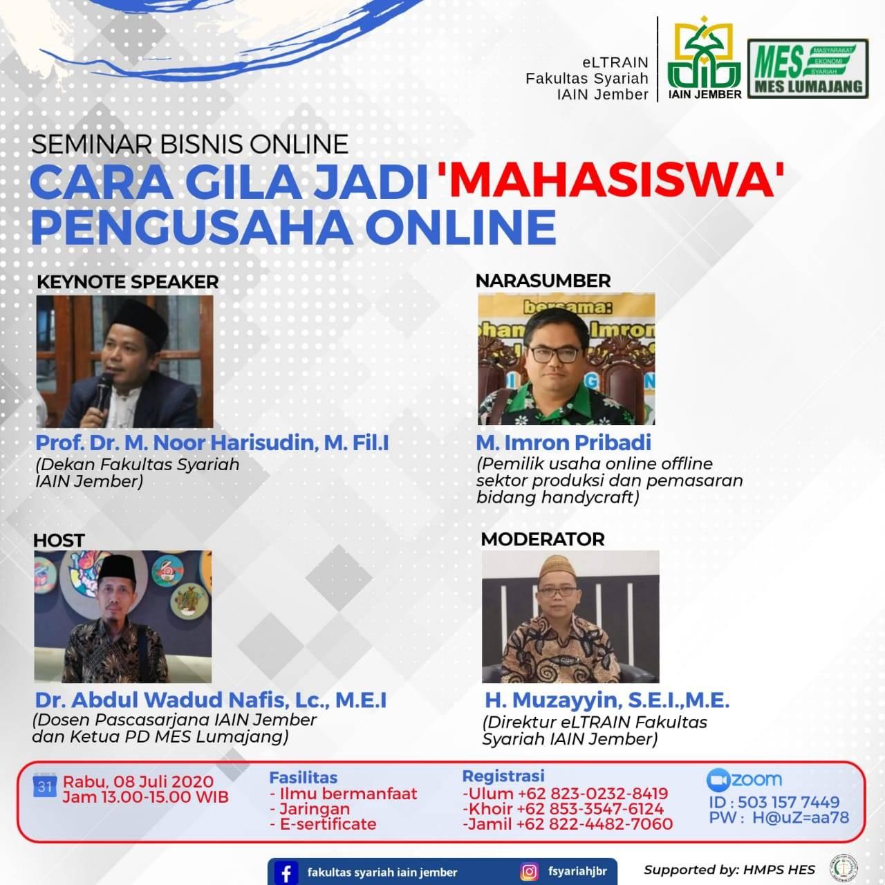 Salah satu wujud dari wacana tersebut, kini Fakultas Syariah membentuk wadah baru bernama Lembaga Training Entrepreneur atau yang dikenal dengan eLTRAIN. Lembaga yang dibentuk dalam rangka mempersiapkan mahasiswa memasuki dunia kerja itu akhirnya sukses menggelar kegiatan perdananya dengan mengadakan Seminar Bisnis Online yang bertajuk ‘Cara Gila Jadi Mahasiswa Pengusaha Gila’ pada Rabu (siang) 8 Juli 2020. Acara ini menggunakan aplikasi Zoom Meating.
