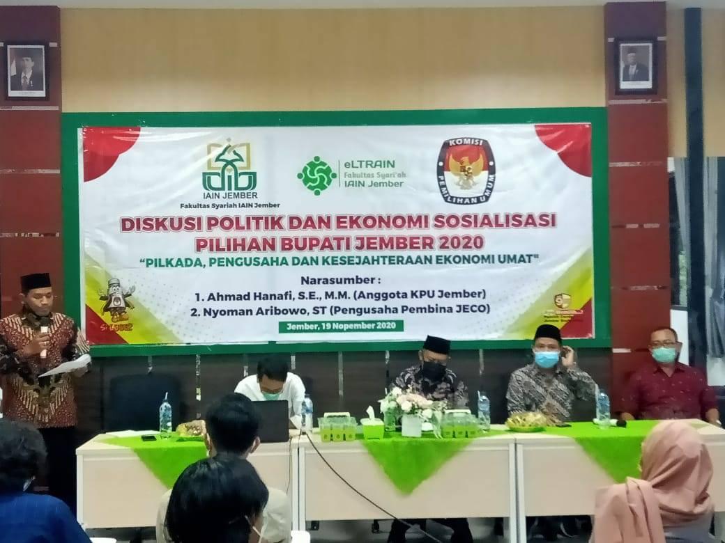 JEMBER-Fakultas Syariah Institut Agama Islam Negeri (IAIN) Jember kembali melakukan acara keren yang bertema "Pilkada, Pengusaha dan Kesejahteraan Ekonomi Ummat". Tiga lembaga di antaranya Fakultas Syariah, Komisi Pemilihan Umun (KPU), dan juga eLTRAIN Syariah. Acara yang diselenggarakan Kamis, 19 Nopember 2020 ini dihadiri empat puluh mahasiswa dan Dosen Syariah IAIN Jember di AULA VIP Lantai 2 Fakultas Syariah dengan protokol kesehatan yang ketat.