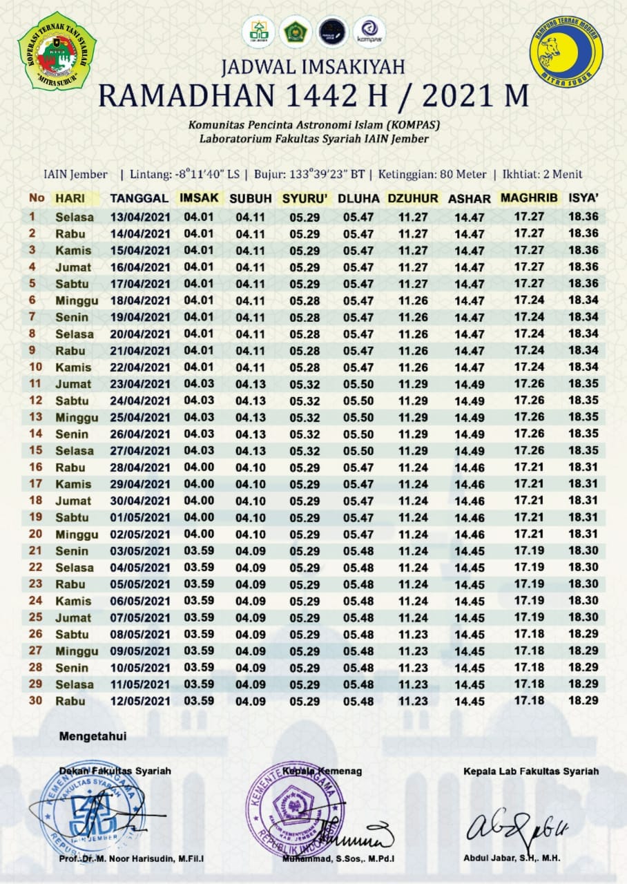 SAMBUT BULAN SUCI RAMADAN, KOMPAS IAIN JEMBER LUNCURKAN JADWAL IMSAKIAH RAMADAN 1442 H/2021 M