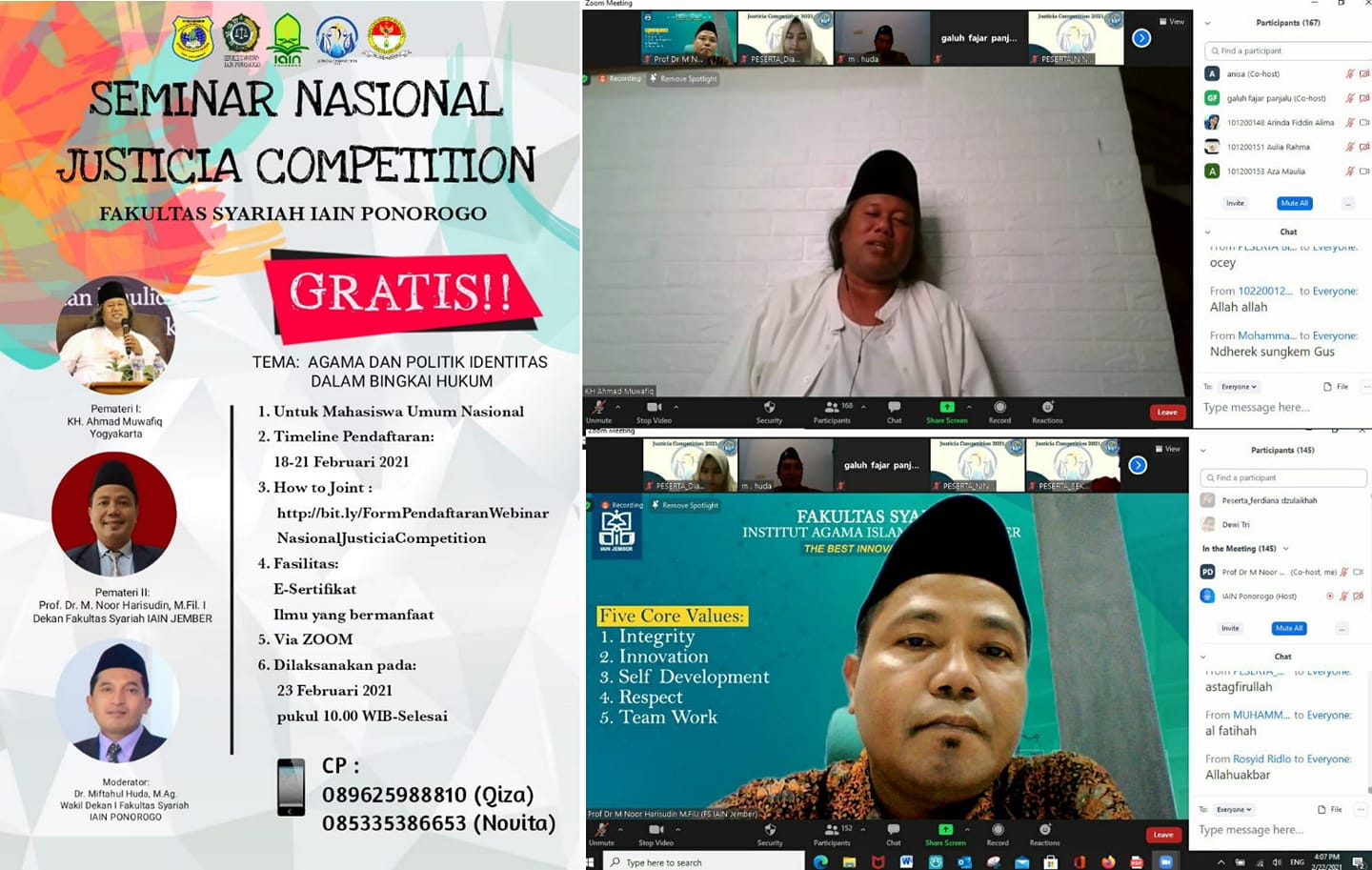 Badan Eksekutif Mahasiswa Fakultas (BEM-F) Fakultas Syariah Institut Agama Islam Negeri (IAIN) Ponorogo menyelenggarakan Seminar Nasional dalam rangka “Justicia Competition”, berlangsung secara online menggunakan aplikasi Zoom Meeting pada Selasa, (23/02) dari pukul 11.00-12.30 WIB.