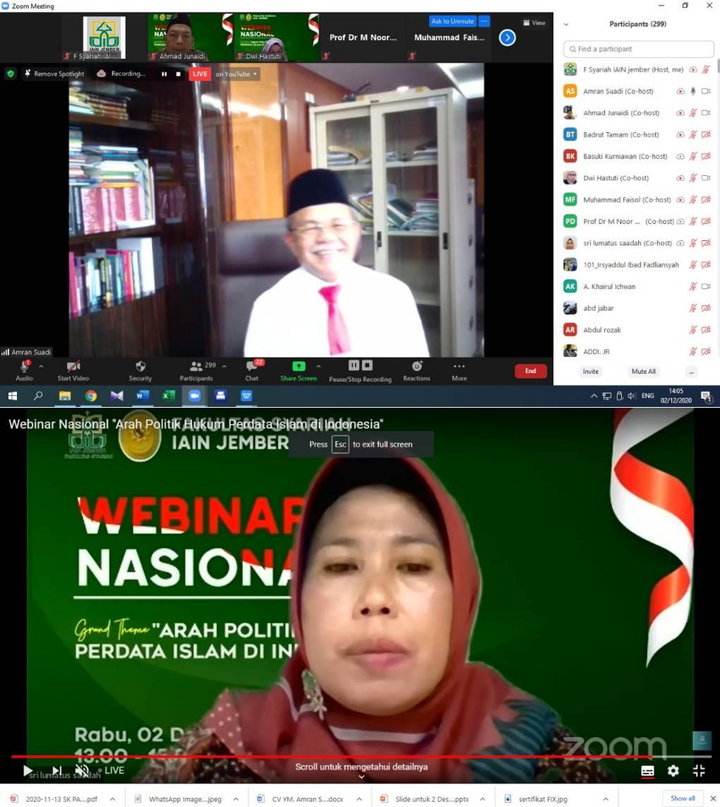 Media Center – Setelah sebelumnya Fakultas Syariah IAIN Jember menggelar Webinar bersama Mahkamah Konstitusi (MK), kini Fakultas Syariah menggelar Webinar dengan Mahkamah Agung. Acara tersebut mengangkat tema “Arah Politik Hukum Perdata Islam Di Indonesia” yang dilaksanakan secara virtual melalui zoom meeting dan youtube, pada Rabu (03/12/2020).
