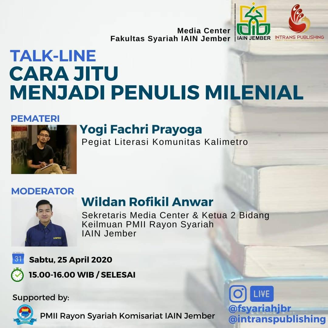 Talk Line ini ditayangkan mulai pukul 15.00 sampai 16.00 WIB yang dipandu oleh moderator Wildan Rofikil Anwar melalui akun instagram @fsyariahjbr dan narasumber @intranspublishing. Tayangan ini telah disaksikan oleh puluhan peserta dari kalangan mahasiswa maupun masyarakat umum.