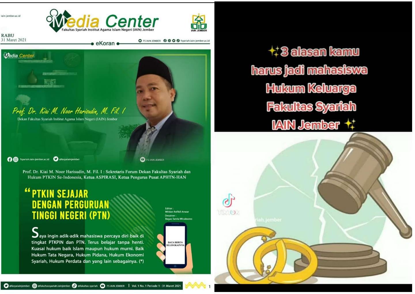 Adapun yang memprakarsai adanya tik tok dan E-Koran ini yaitu Izza Qotrun Nada, dan Bagas Satria Wicaksono, keduanya merupakan pengurus Tim Media Center Fakultas Syariah IAIN Jember periode 2021-2022. TikTok fakultas syariah berisi macam-macam kegiatan yang ada di fakultas syariah, termasuk ke dalamnya beberapa organisasi yang dinaunginya (fakultas syariah, Red) dan juga digunakan sebagai sarana untuk mengenalkan fakultas syariah ke khalayak umum. Dan E-Koran merupakan bentuk penyampaian berita yang sengaja dibuat ‘kekinian’ sehingga lebih menarik untuk disuguhkan.