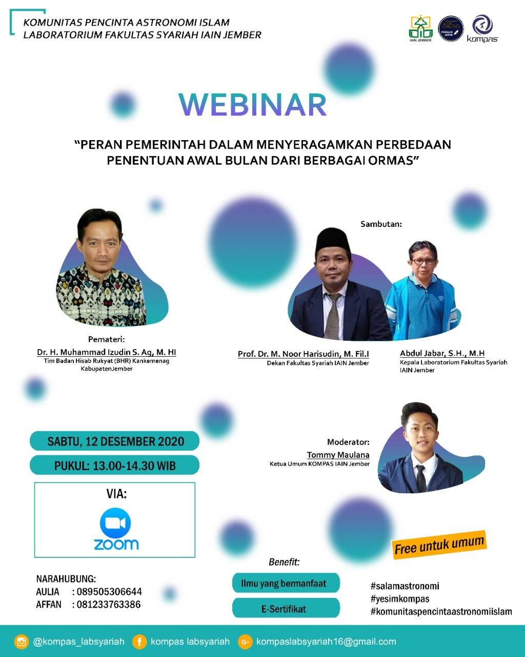 Media Center - Komunitas Pecinta Astronomi Islam (Kompas) Institut Agama Islam Negeri (IAIN) Jember menyelenggarakan Webinar Nasional dengan tema “Peran Pemerintah dalam Menyeragamkan Perbedaan Penentuan Awal Bulan dari Berbagai Ormas.” Acara tersebut dilaksanakan secara online melalui aplikasi zoom meeting pada Sabtu siang, 12 Desember 2020.