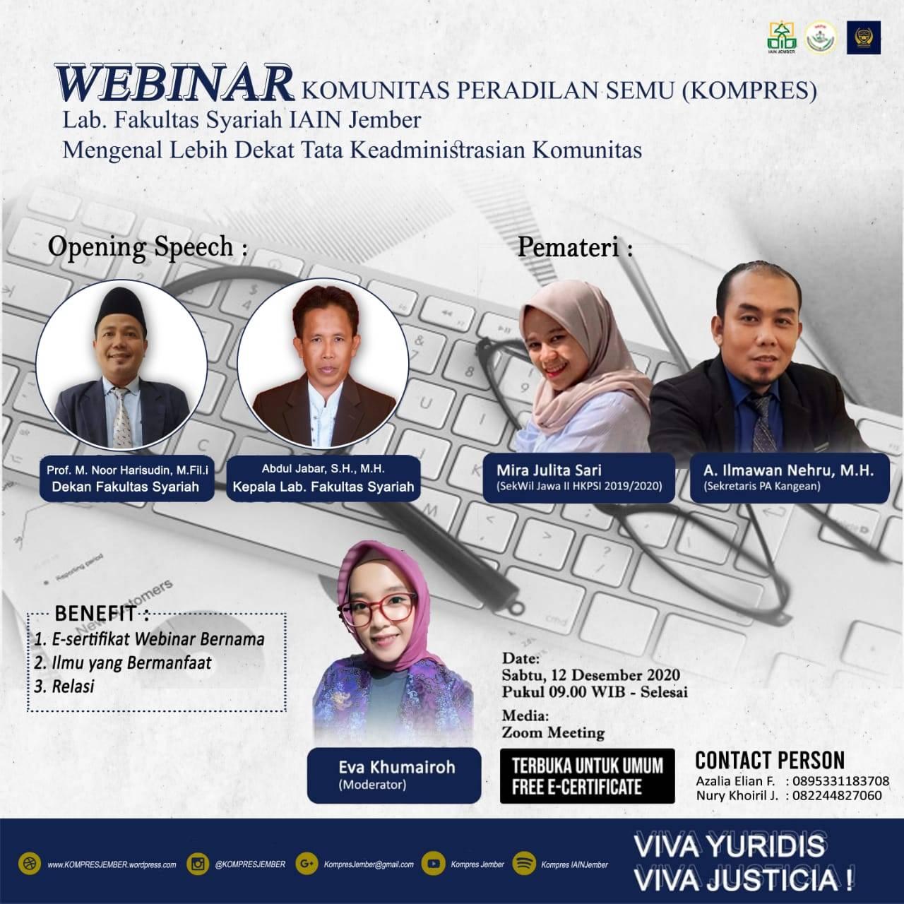 Media Center - Sabtu, 12 Desember 2020 pukul 09.00 WIB Komunitas Peradilan Semua IAN Jember yang lebih dikenal dengan KOMPRES di bawah naungan Laboratorium Fakultas Syariah IAN Jember melaksanakan Webinar bertema “Mengenal Lebih Dekat Tata Keadministrasian Komunitas”. Tema yang diangkat cukup menarik karena pada hakikatnya materi keadministrasian tidak termaktub dalam kurikulum Fakultas. Sehingga menjadi pengetahuan baru bagi peserta yang mengikutinya.