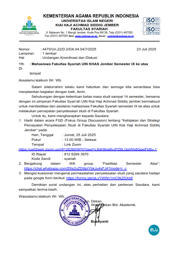 UNDANGAN KOORDINASI DAN DISKUSI MAHASISWA SEMESTER 9 KE ATAS