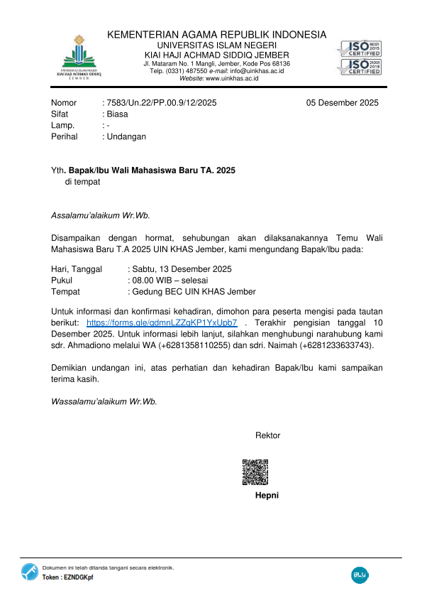 Undangan Temu Wali Mahasiswa Baru T.A 2025 UIN KHAS Jember