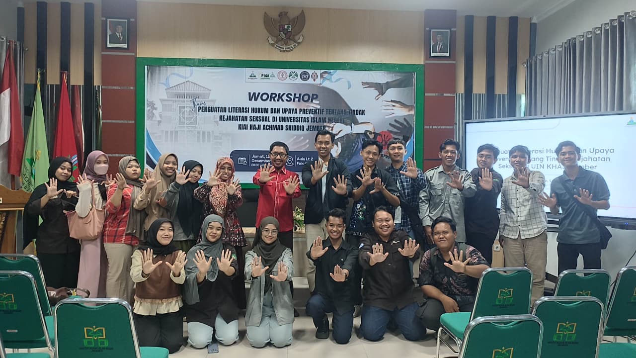 Jember, Fasya Media – UIN Kiai Haji Achmad Siddiq (KHAS) Jember kembali menunjukkan komitmennya dalam menciptakan lingkungan kampus yang aman, beretika, dan bebas dari kekerasan seksual menyelenggarakan kegiatan workshop melalui kegiatan pengabdian masyarakat berjudul “Penguatan Literasi Hukum dan Upaya Preventif Tindak Kekerasan Seksual”. Kegiatan ini diselenggarakan oleh tim pengabdian dosen Fakultas Syariah yang berkolaborasi dengan Pusat Studi Gender dan Anak (PSGA), LKBHI, dan Dewan Eksekutif Mahasiswa Fakultas Syariah dan juga melibatkan berbagai Organisasi Kemahasiswaan UIN KHAS Jember, pada hari Jumat tanggal 12 Desember 2025, bertempat di Aula Lantai 2 Fakultas Syariah. Kegiatan ini dihadiri oleh segenap sivitas akademika UIN KHAS diantaranya Dosen, Mahasiswa, dan tendik.