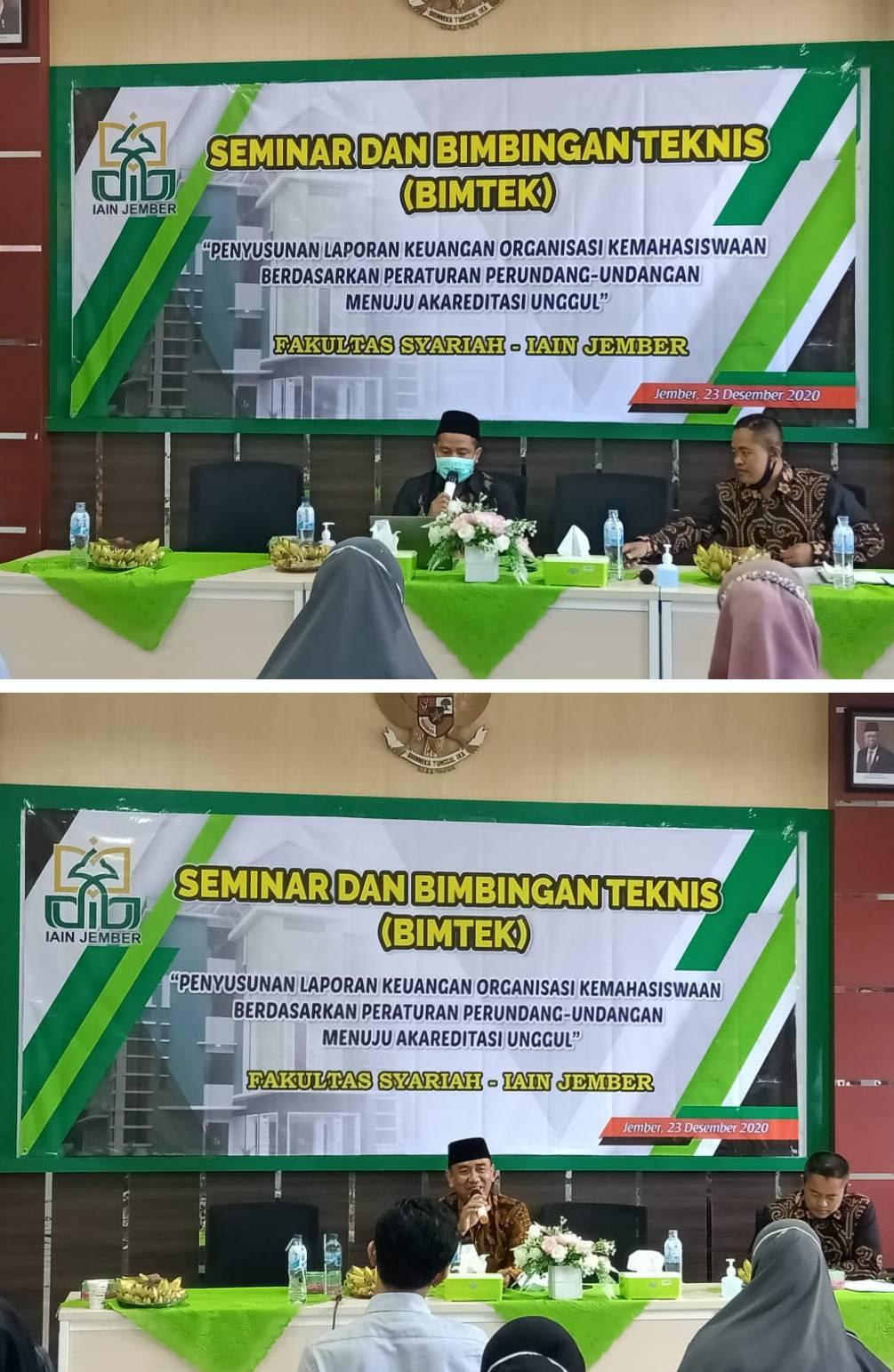 Media Center - Penyelenggaraan laporan keuangan organisasi kemahasiswaan yang bersih, tertib dan sesuai dengan tupoksi (tujuan, pokok dan isi), merupakan tanggung jawab semua instansi, termasuk mahasiswa dalam rangka mewujudkan tata kelola yang baik (good governance). Oleh karenanya, Fakultas Syariah IAIN Jember menggelorakan seminar dan bimbingan teknis (Bimtek) untuk mengupayakan birokrasi menjadi organisasi yang efisien, transparan dan akuntabel. Rabu (23/12).